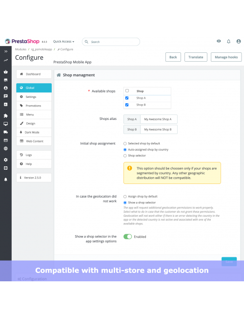 Módulo para PrestaShop que le permite detectar el país y el idioma de sus visitantes y configura redireccionamientos, el idioma predeterminado del cliente, la moneda y el transportista, además de otras acciones.