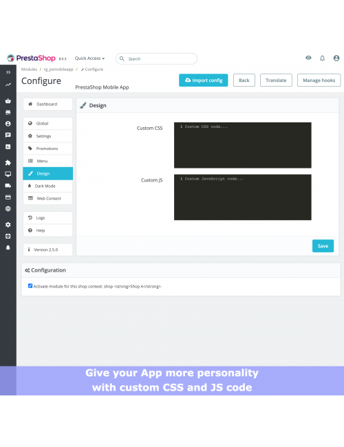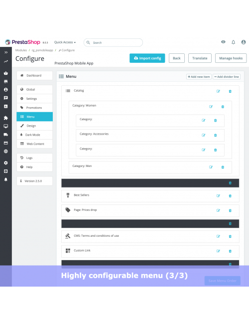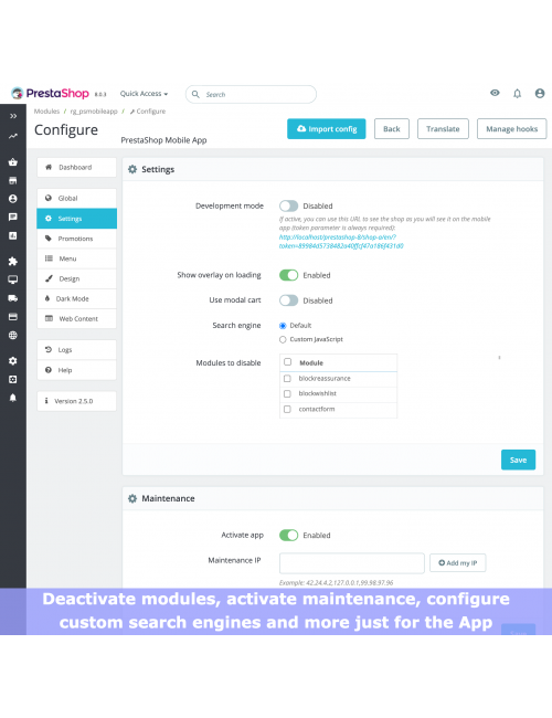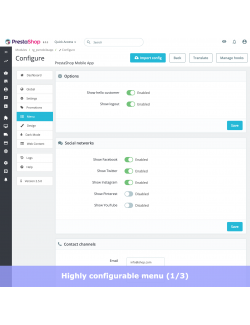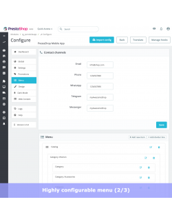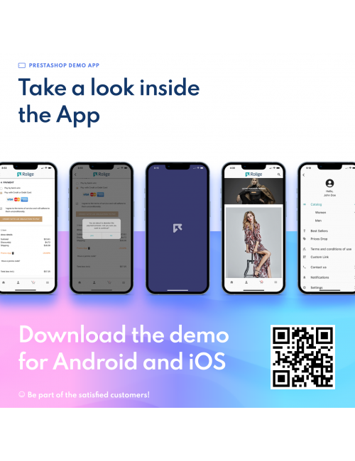 Aplicación móvil PrestaShop premium para Android y iOS. Se integra a la perfección con cualquier tienda manteniendo el diseño actual del sitio y usando los mismos métodos de pago y envío ya configurados. Compatible con dispositivos Android y iOS.