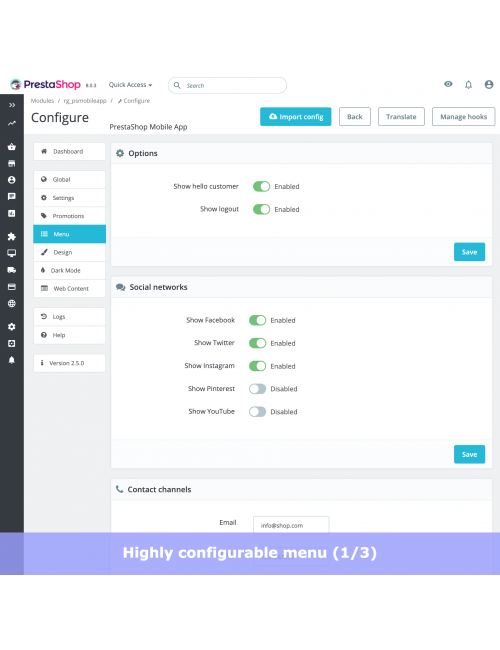 Personalización del menú, redes sociales y formas de contacto para la app.